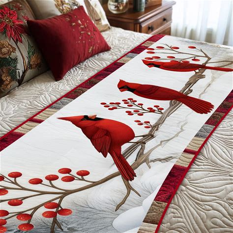 Red Cardinal Bed Quilt Runner, Christmas Cardinal Bedroom Decor, Quilted Style Holiday Bed Scarf, Winter Red Bird Home Decor